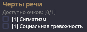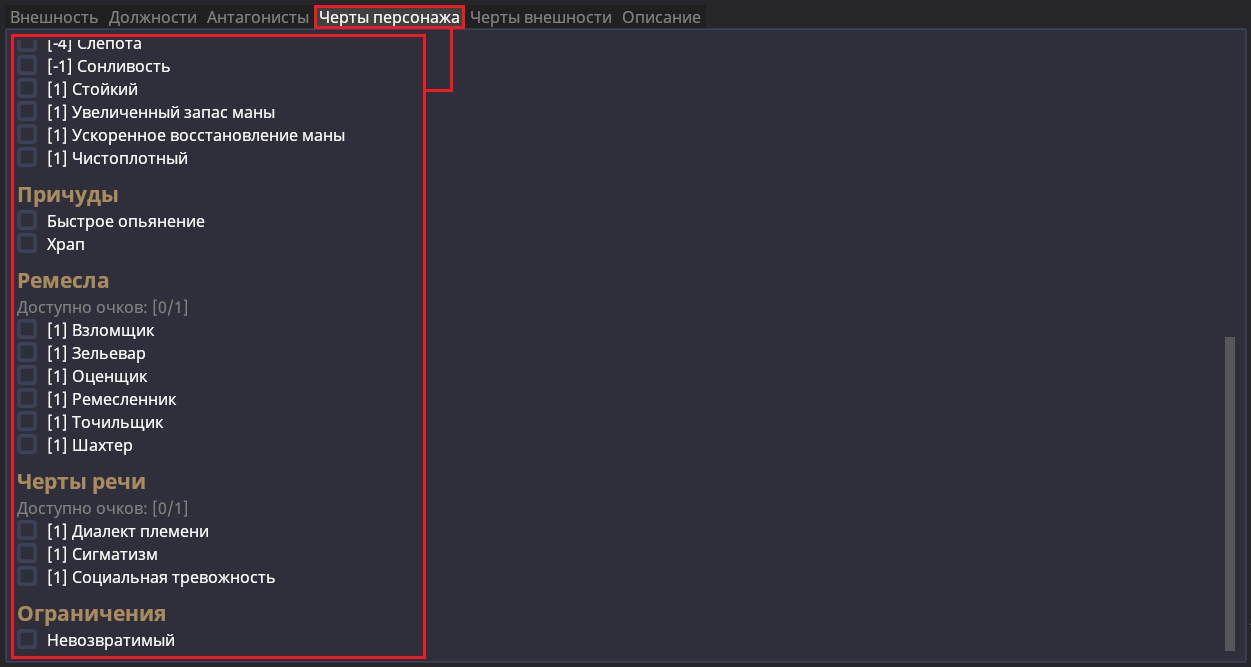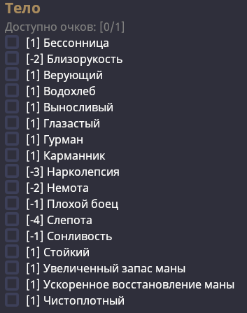 В этом пункте можно выбрать как положительные, так и отрицательные особенности персонажа, выбирая отрицательные вы можете получить больше очков, благодаря чему, сможете выбрать больше положительных черт.
