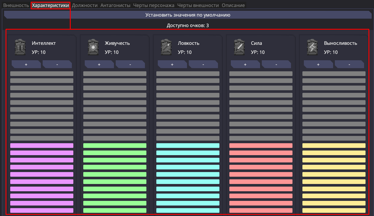 Изначально у вас есть 3 свободных очка, которые вы можете вложить в любую из характеристик. Чтобы получить больше очков, вы должны понизить одну из характеристик.