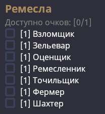 - Ремесленник — скорость создания предметов на верстаках увеличивается в четыре раза.