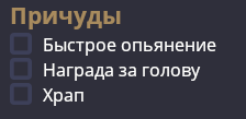 - Быстрое опьянение — персонаж быстрее пьянеет от всевозможного алкоголя.