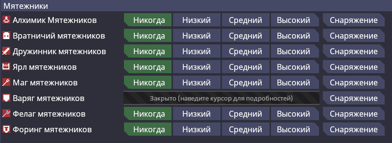 - Маг мятежников — владеет магией, может как лечить соратников, так и идти в бой против врагов мятежа.